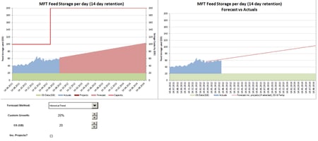 In the previous three parts of this blog series we have developed a forecast of file storage size and implemented some parameters to allow the end user to adjust the forecast (such as adding additional growth to the forecast or assigning some storage to the operating system). In this final part, we’ll discuss how projects can be included in the forecast and some tips to getting our charts looking good. As a reminder, we are trying to achieve output charts that look as follows: